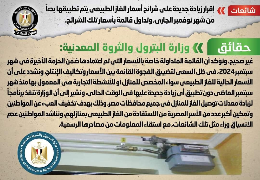 حقيقة شائعة.. إقرار زيادة جديدة على شرائح أسعار الغاز الطبيعي بدءاً من شهر نوفمبر الجاري