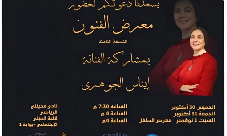 يقام معرض الفنون في نادي مدينتي الرياضي/ المبنى الاجتماعي ، ويقام الافتتاح في الساعة السابعة مساء..