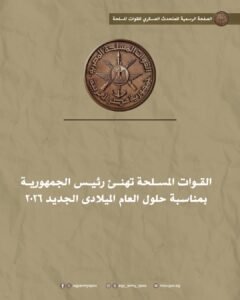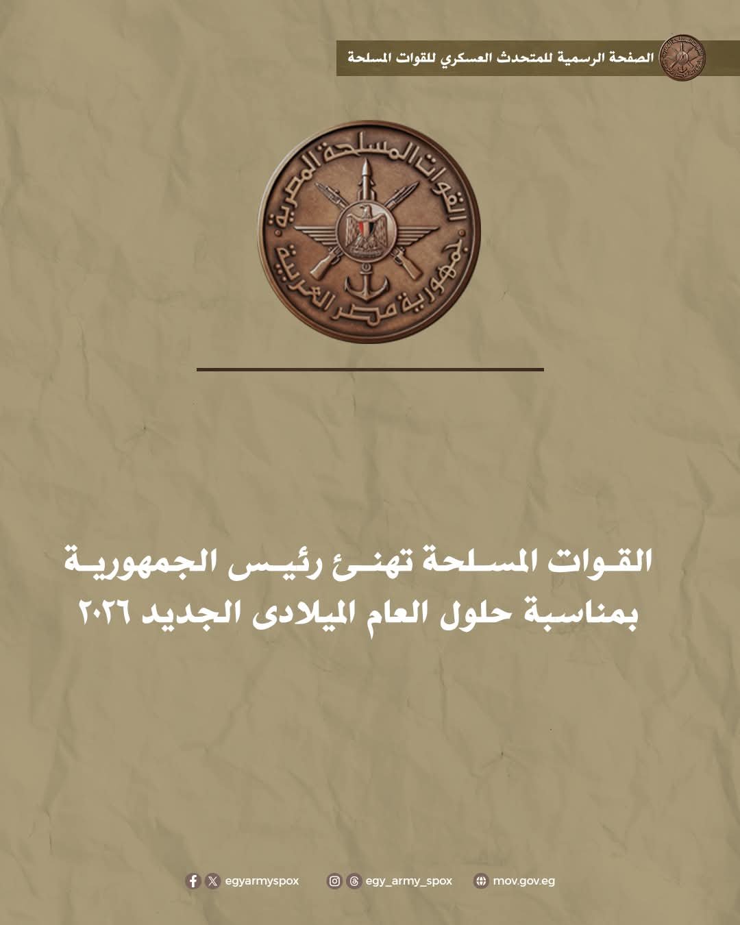 بعث الفريق أول / عبد المجيد صقر القائـد العـام للقـوات المسلحـة وزيـر الدفـاع والإنتـاج الحربـى ببرقيـة تهنئـة للسيد الرئيـس / عبد الفتاح السيسى رئيـس الجمهوريـة القائد الأعلى للقوات المسلحة بمناسبـة حلول العام الميلادى الجديد 2026 ، وجاء نصها :