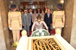 وقام الفريق أول / عبد المجيد صقر بوضع إكليل من الزهور على ضريح الرئيس الراحل / جمال عبد الناصر وقراءة الفاتحة ترحماً على روحه الطاهرة .