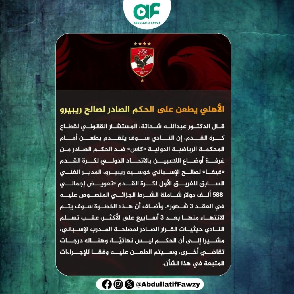 قال الدكتور عبدالله شحاتة، المستشار القانوني لقطاع كرة القدم، إن النادي سوف يتقدم بطعن أمام المحكمة الرياضية الدولية «كاس» ضد الحكم الصادر من غرفة أوضاع اللاعبين بالاتحاد الدولي لكرة القدم «فيفا» لصالح الإسباني خوسيه ريبيرو، المدير الفني السابق للفريق الأول لكرة القدم تعويض إجمالي 588 ألف دولار شاملة الشرط الجزائي المنصوص عليه في العقد 3 شهور»