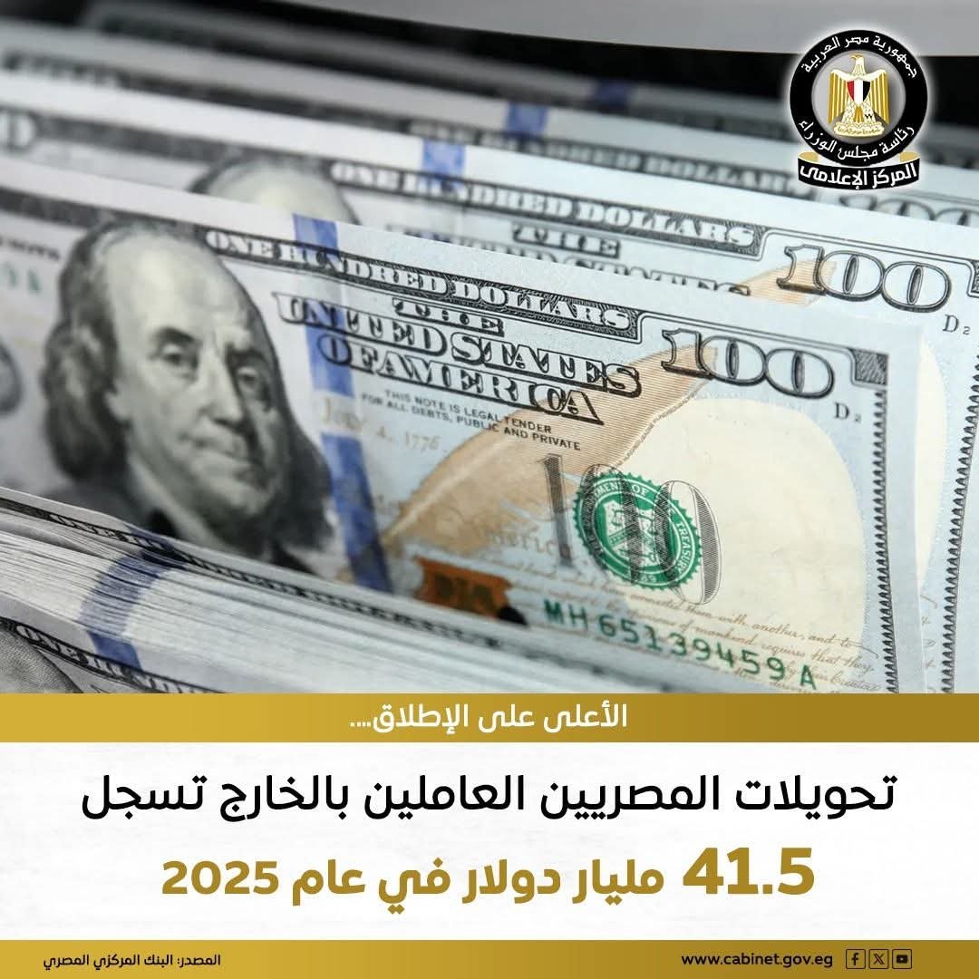 شهدت تحويلات المصريين العاملين بالخارج أداءً قويًا خلال عام 2025، مسجلة أعلى مستوى تاريخي لها، بعد نموها بنسبة 40.5% لتصل إلى نحو 41.5 مليار دولار مقابل نحو 29.6 مليار دولار في عام 2024.