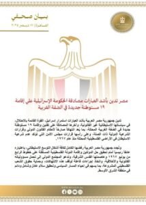 وتُجدد جمهورية مصر العربية رفضها الكامل لكافة أشكال التوسع الاستيطاني، باعتباره عائقاً رئيسياً أمام تحقيق حل الدولتين وإقامة الدولة الفلسطينية المستقلة على خطوط الرابع من يونيو ١٩٦٧ وعاصمتها القدس الشرقية، وتدعو المجتمع الدولي إلى تحمل مسؤولياته القانونية والأخلاقية، واتخاذ إجراءات فاعلة لوقف هذه الانتهاكات، وحماية حقوق الشعب الفلسطيني المشروعة، بما يسهم في إحياء المسار السياسي وتحقيق سلام عادل وشامل ودائم في منطقة الشرق الأوسط.