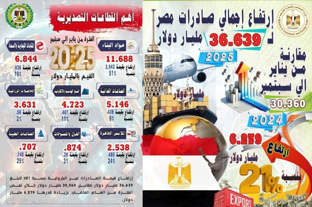 وتضمنت أهم القطاعات التصديرية التي شكلت هيكل الصادرات المصرية غير البترولية خلال الفترة من يناير حتى سبتمبر 2025 قطاع مواد البناء بقيمة 11 مليار و 688 مليون دولار وبنسبة زيادة 51% ، قطاع المنتجات الكيماوية والأسمدة بقيمة 6 مليار و 844 مليون دولار وبنسبة زيادة 10% ، قطاع الصناعات الغذائية بقيمة 5 مليار و 146 مليون دولار بنسبة زيادة 9% ، قطاع السلع الهندسية والإلكترونية بقيمة 4 مليار و 723 مليون دولار وبنسبة زيادة 11% ، قطاع الحاصلات الزراعية بقيمة 3 مليار و 631 مليون دولار بنسبة زيادة 2% ، قطاع الملابس الجاهزة بقيمة 2 مليار و 538 مليون دولار وبنسبة زيادة 24% ، قطاع الغزل والمنسوجات بقيمة 874 مليون دولار وبنسبة زيادة 3% ، قطاع الصناعات الطبية بقيمة 707 مليون دولار وبنسبة زيادة 25% ، قطاع الطباعة والتغليف والورق والكتب والمصنفات بقيمة 705 مليون دولار وبنسبة انخفاض 2% ، قطاع المفروشات بقيمة 456 مليون دولار وبنسبة زيادة 3% ، قطاع الأثاث بقيمة 277 مليون دولار وبنسبة زيادة 11% ، قطاع الجلود والأحذية والمنتجات الجلدية بقيمة 72 مليون دولار وبنسبة انخفاض 5% .