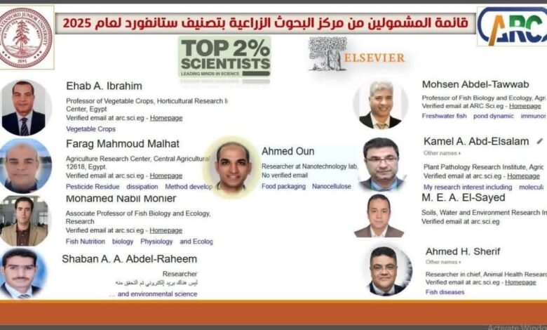 ومن جهته، قال الدكتور عادل عبدالعظيم رئيس مركز البحوث الزراعية، ان التصنيف الذي اصدرته جامعة ستانفورد الأمريكية، بالتعاون مع مؤسسة السفير العالمية، لأفضل 2% من العلماء الأكثر تأثيرًا حول العالم، قد شمل كل من: الدكتور محسن عبد التواب والدكتور محمد نبيل منير من المعمل المركزي لبحوث الثروة السمكية، فضلا عن الدكتور محمد السيد عيد، والدكتور شعبان عبدالرحيم من معهد بحوث الأراضي والمياه والبيئة، إضافة إلى الدكتور كامل احمد عبدالسلام من معهد بحوث أمراض النباتات.