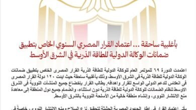 بأغلبية ساحقة … اعتماد القرار المصري السنوي الخاص بتطبيق ضمانات الوكالة الدولية للطاقة الذرية في الشرق الأوسط